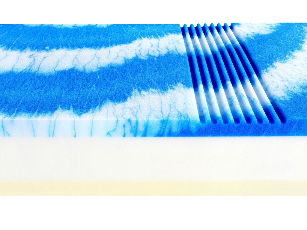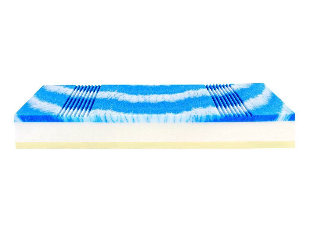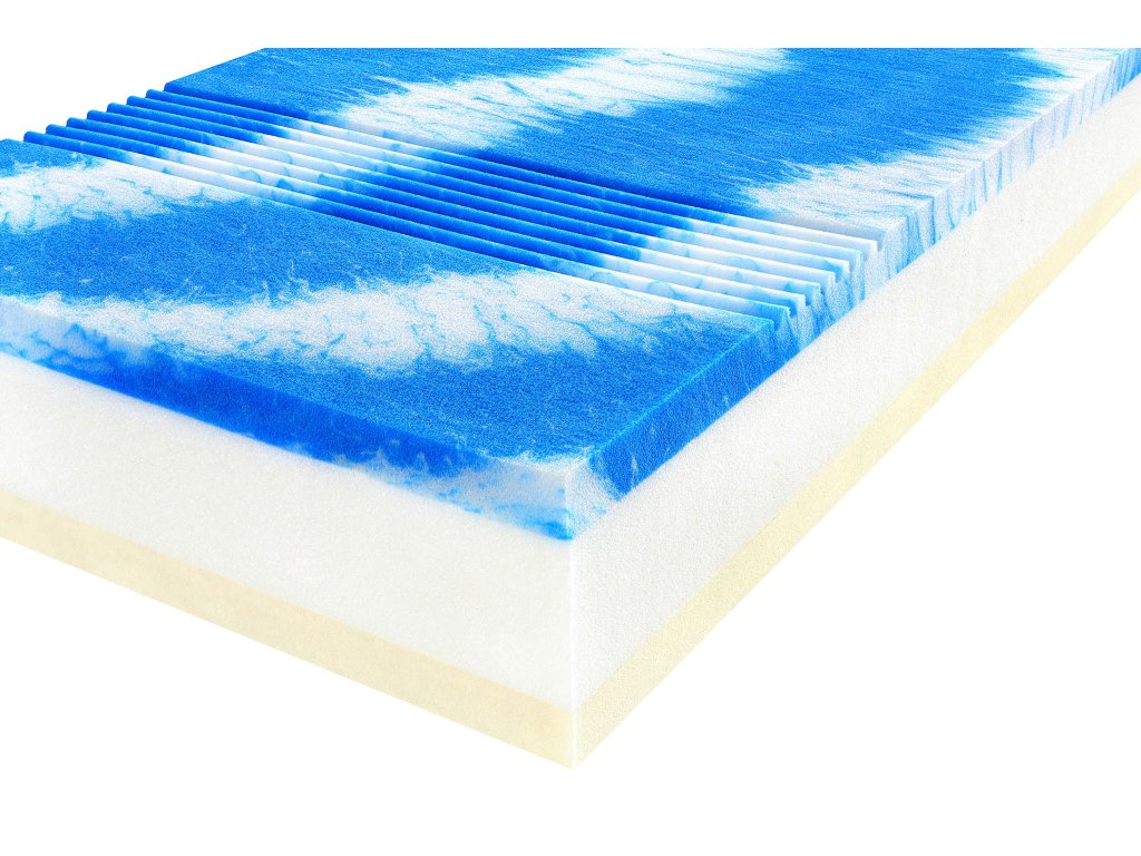 - Geltouch Hybridní pěna (strana soft) Spojuje hebkost latexu s dokonalou distribucí tlaku gelových matrací. Vysoce prodyšná, napomáhá správné termoregulaci.